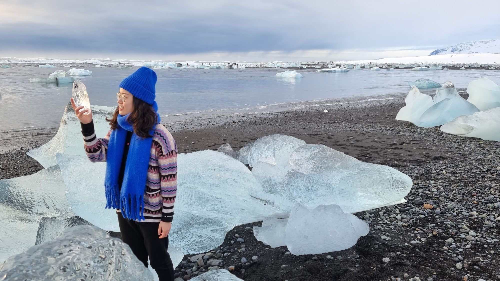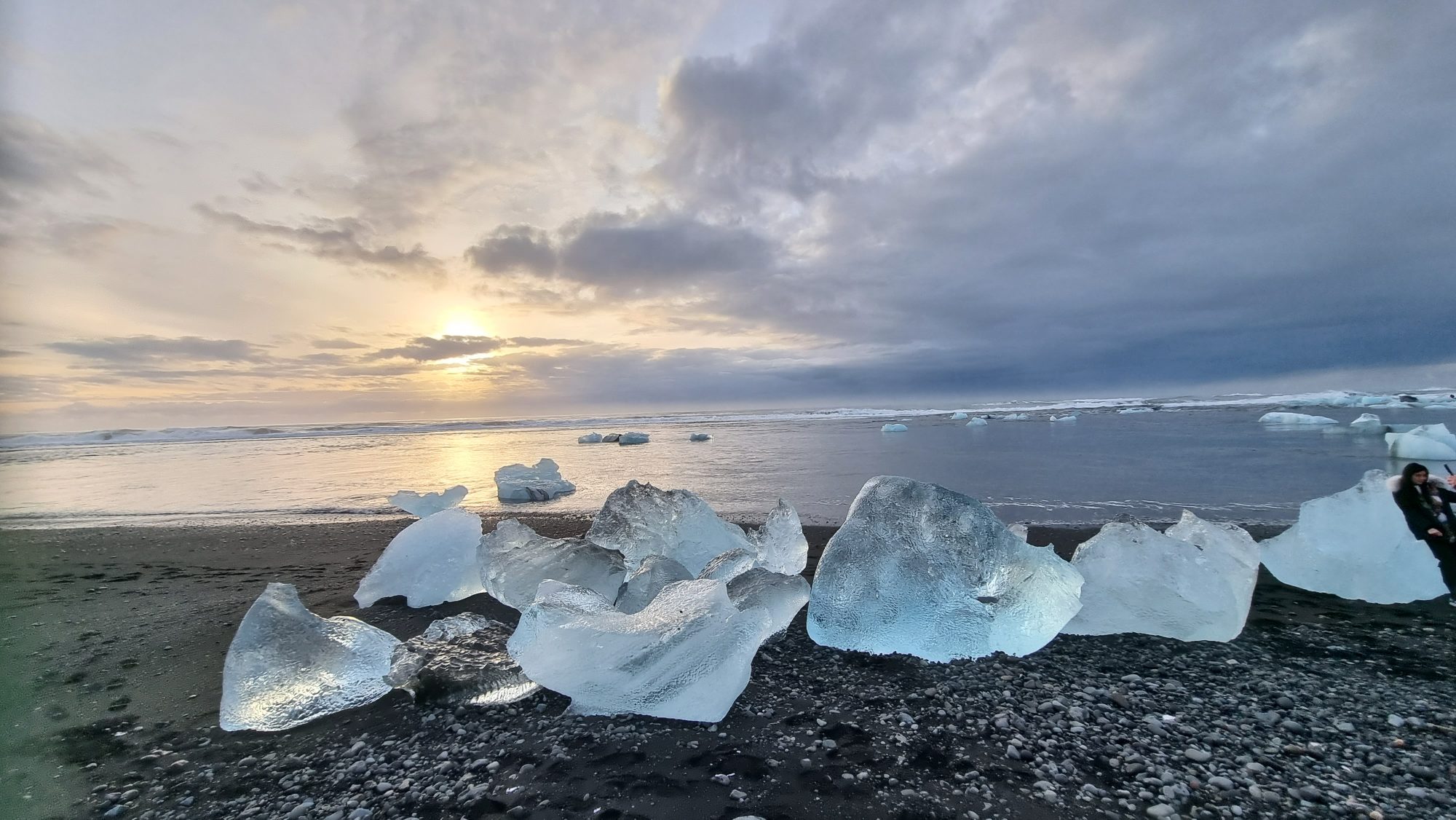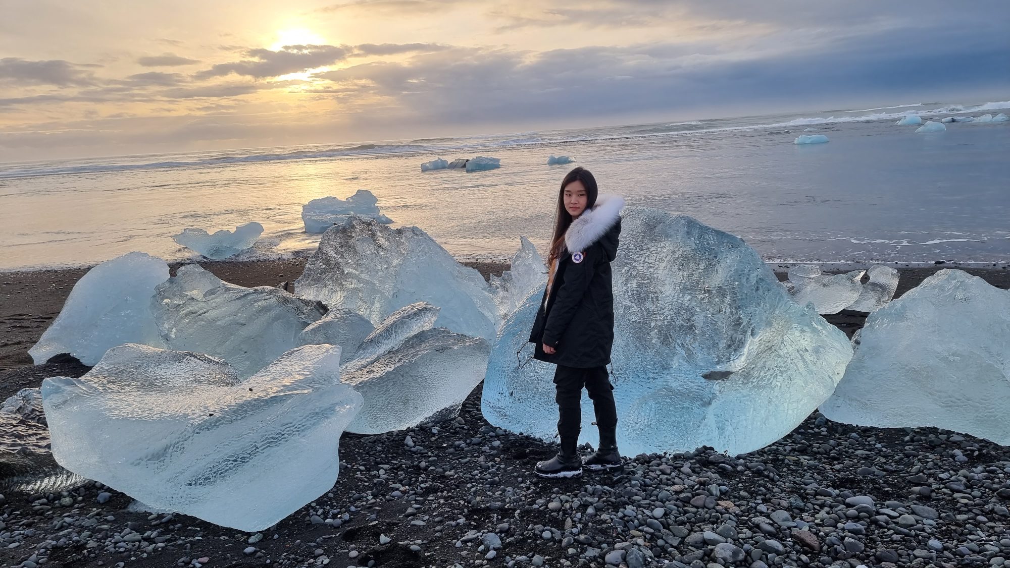 Black sand, sparkling ice — the ultimate contrast shot. When the ice washes up, it looks like diamonds scattered across a volcanic shoreline.